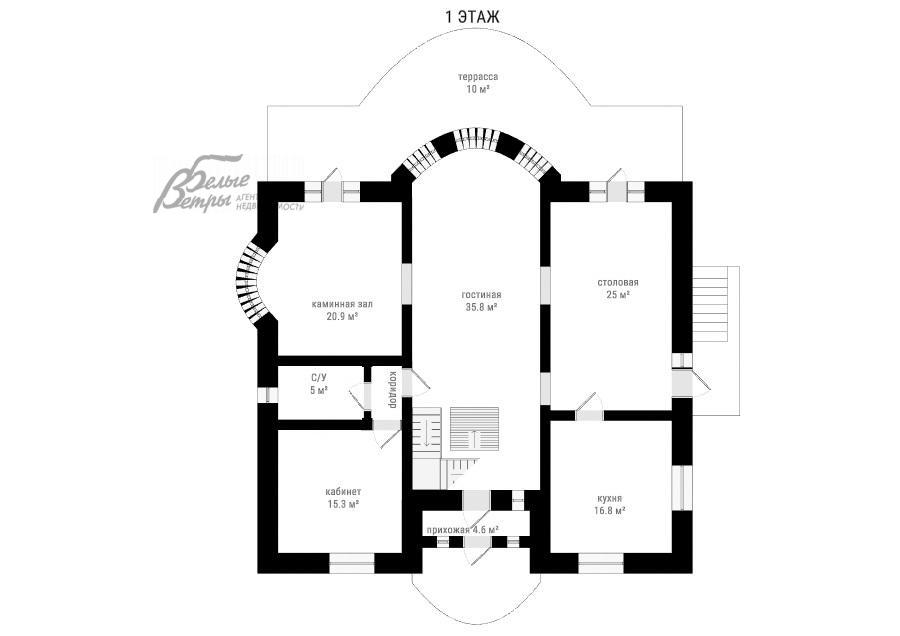 1-ый этаж: rрыльцо, прихожая 4.6 кв.м, гостиная 36 кв.м, столовая 25 кв.м с выходом на террасу, кухня 17 кв.м, каминный зал 21 кв.м с камином из мрамора и выходом на летнюю террасу, кабинет-спальня 15 кв.м, санузел 5 кв.м